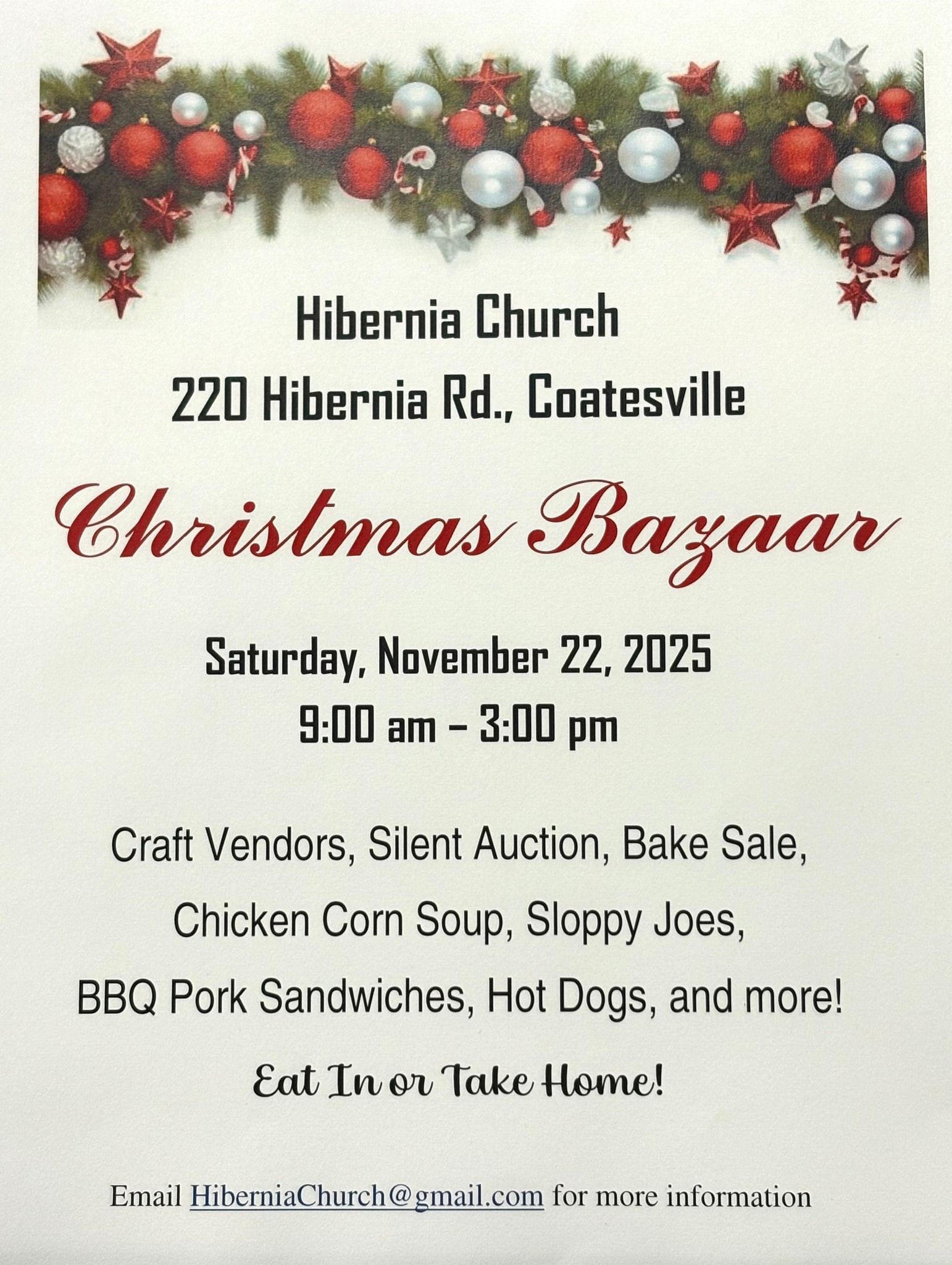 Join us for our Annual Christmas Bazaar and Silent Auction on Saturday November 22nd, 2025 from 9 am to 3 pm. Silent Auction bidding ends at 2:15. Do some shopping and support local crafters and vendors with unique gifts! Enjoy lunch or get it to go! We are located North of Coatesville near Hibernia Park and our address is 220 Hibernia Road Coatesville. For more information email HiberniaChurch@gmail.com